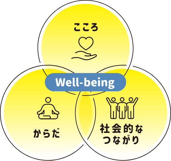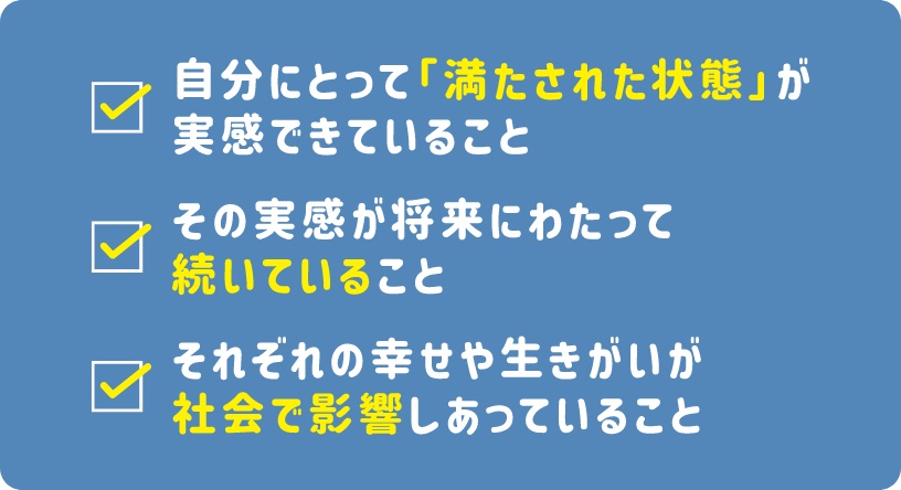 • 身体的・精神的・社会的に良い状態にあることをいい、短期的な幸福のみならず、生きがいや人生の意義などの将来にわたる持続的な幸福を含む概念。
