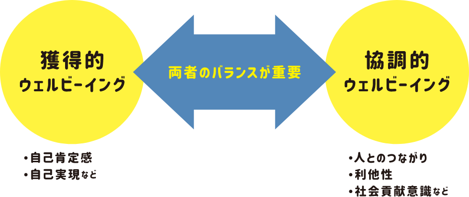 特に日本では、社会・文化的背景を踏まえて、自己肯定感や自己実現などの主観的な要素と、人とのつながりや社会貢献意識などの協調的な要素とのバランスを取り入れた「調和と協調」に基づくWell-beingの向上が求められています。